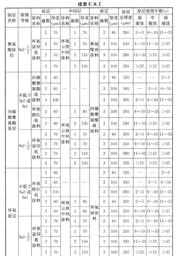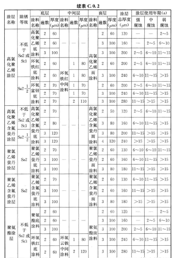 根據《工業建筑防腐蝕設計標準》GB/T 50046-2018第3.3.3條,防護層的設計使用年限應符合下列規定: